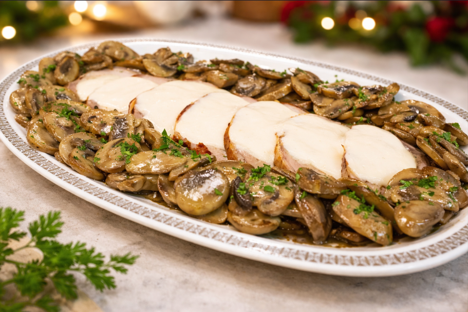 I funghi sono un accompagnamento perfetto per questo arrosto, perché aggiungono profumo e completano il piatto in modo elegante.