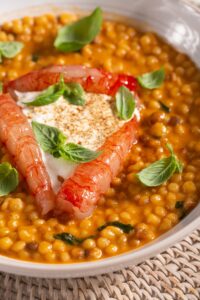 In questa preparazione, la fregola viene valorizzata da un condimento morbido e avvolgente, in cui il sapore del mare incontra la delicatezza della burrata e la freschezza del basilico. I gamberi rossi sono l’ingrediente che rende il piatto davvero speciale. La loro carne tenera, succosa e leggermente dolce aggiunge profondità e raffinatezza, trasformando una semplice ricetta in una proposta dal carattere gourmet. La burrata, invece, regala una nota cremosa e vellutata che bilancia perfettamente la sapidità dei crostacei, mentre il basilico fresco dona profumo, leggerezza e un tocco mediterraneo irresistibile.