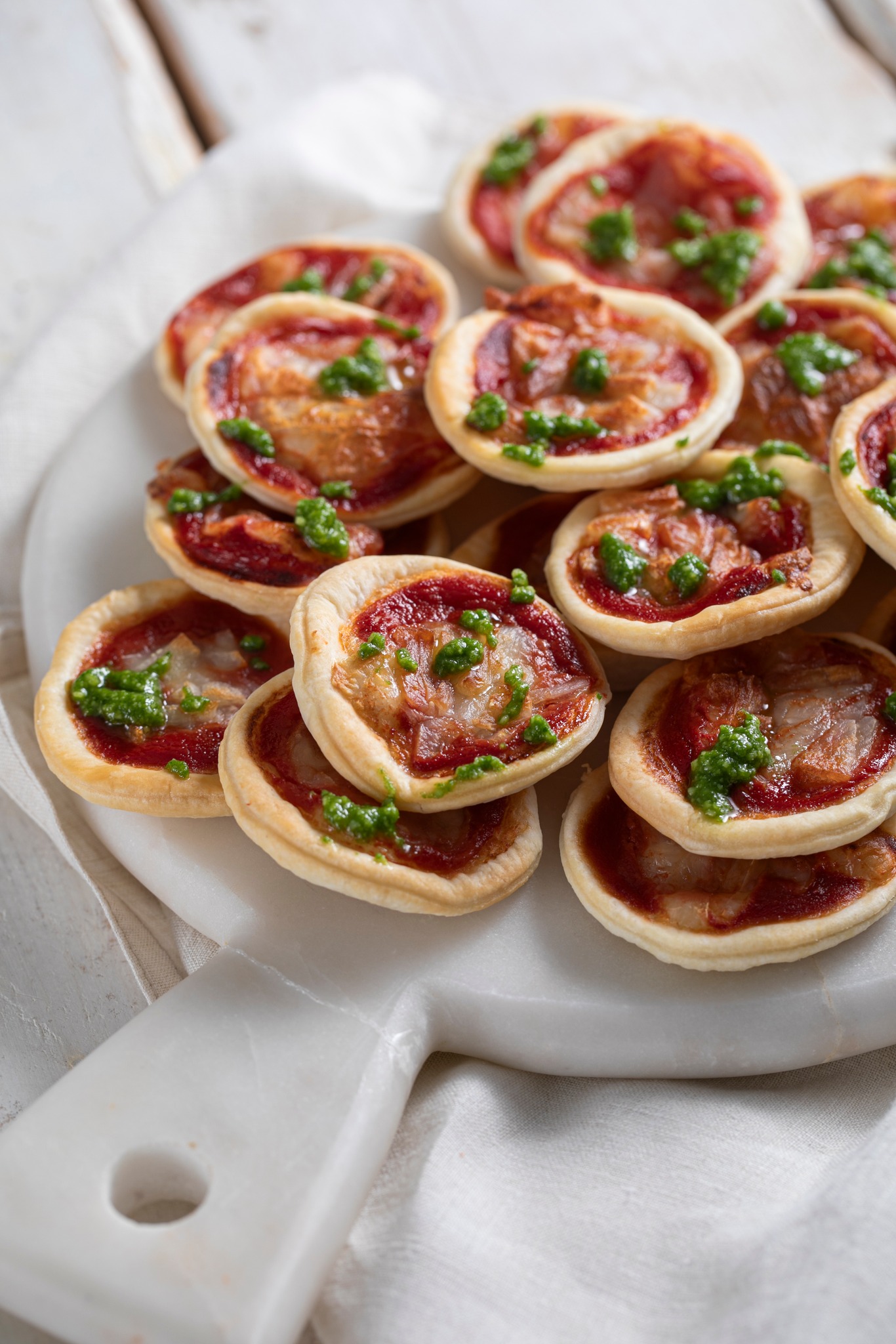 Le mini pizzette sono già belle di loro, ma con qualche piccolo accorgimento possono diventare ancora più irresistibili. Servirle su un piano chiaro o su un tagliere rustico aiuta a valorizzare i loro colori. Disporle in modo leggermente sovrapposto crea un effetto più abbondante e accogliente. Anche il contrasto cromatico ha la sua importanza: il rosso del pomodoro, il bianco del formaggio dorato e il verde del pesto rendono subito il piatto più vivo e appetitoso.
