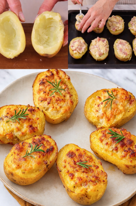 Le patate ripiene sono un piatto tradizionale che consiste nello svuotare parzialmente le patate bollite o cotte, mescolare la loro polpa con ingredienti saporiti come formaggi e salumi, e infine cuocerle nuovamente in forno fino a ottenere una superficie dorata e croccante.