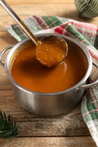 Una gravy fatta bene deve velare il cucchiaio senza risultare troppo pesante. Se è troppo liquida, basta prolungare leggermente la cottura per farla addensare. Se invece dovesse risultare troppo densa, si può aggiungere ancora un po’ di brodo caldo, poco per volta, fino a raggiungere la consistenza desiderata. Questo equilibrio è fondamentale, perché una salsa troppo liquida non riuscirebbe ad aderire bene agli alimenti, mentre una troppo compatta rischierebbe di risultare pesante e meno piacevole al palato. La consistenza ideale è quella di una salsa morbida, cremosa e ben legata.