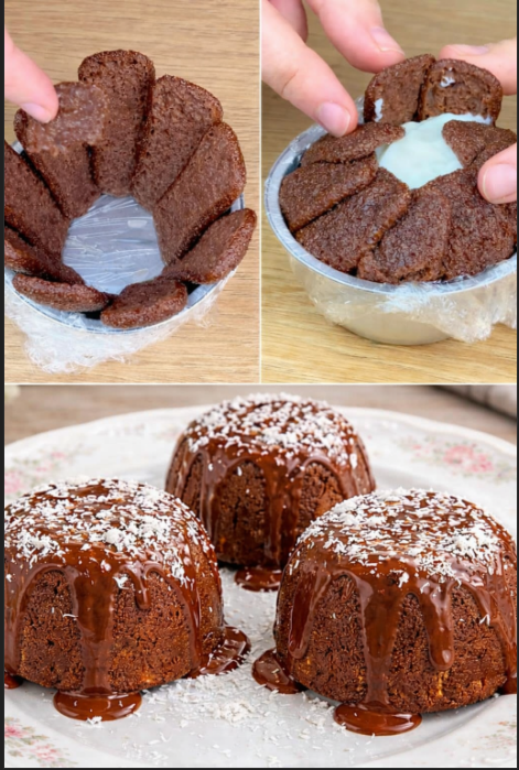 Sforma delicatamente il tortino, versaci sopra la salsa al cioccolato e completa con una spolverata di cocco grattugiato.